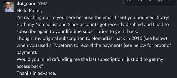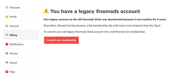 make message if people have an old hashtag nomads Slack account but not a Nomad List membership they need to convert it