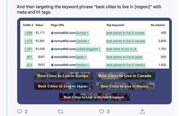try change page titles and <h1> from "Best Cities in..." to "Best Places in..." because I rank more for those I think and search volume is much higher for "Best Places" than "Best Cities" (via twitter.com/GoodMarketingHQ/s…)