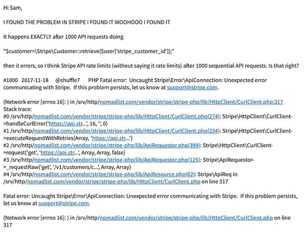 send Stripe API support that I found the problem, they block you from the network if you do 1,000 sequential API requests (like you do in any cron job) #nomads