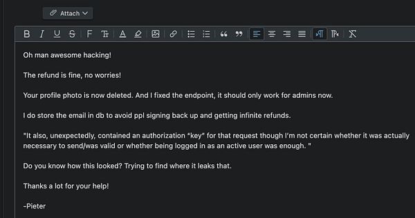 find out guy who got the account deletion email was him hacking my API endpoints, fix admin only endpoint now (you could only delete your own account but still it did some admin stuff), and ask where it leaked info #nomads