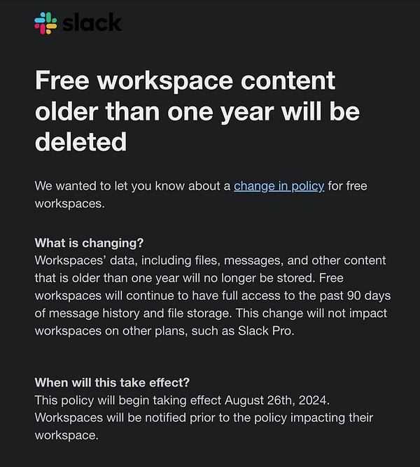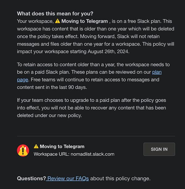 get msg from Slack they will delete ALL our Nomad List chat archive