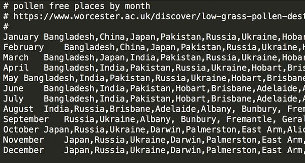 collect data on hayfever pollen per place per month