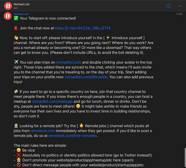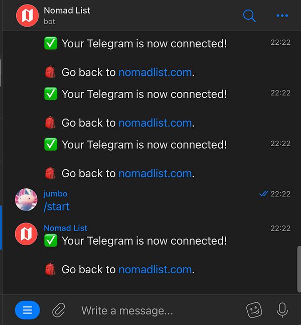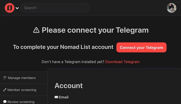 if user enters #nomads Telegram chat with the secret link and they don’t have their Telegram connected (which after they get the secret link) then immediately kick and ban and unban them so they can try again