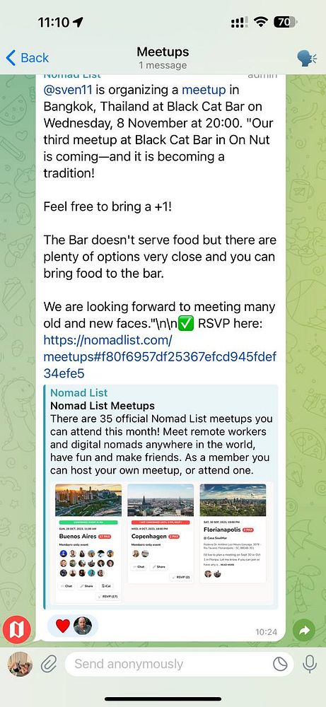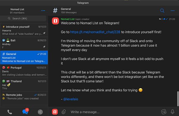 close down the old Nomad Social chats on Telegram and forward to @nomadlist_chat