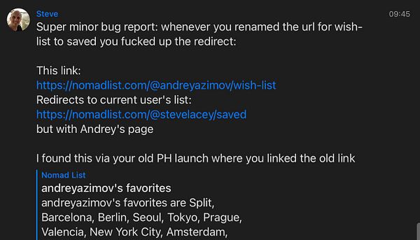 #nomads /@username/saved goes show’s self favorited cities that user, redirect to profile with hashtag favorites for simplicity instead (via @stevelacey)