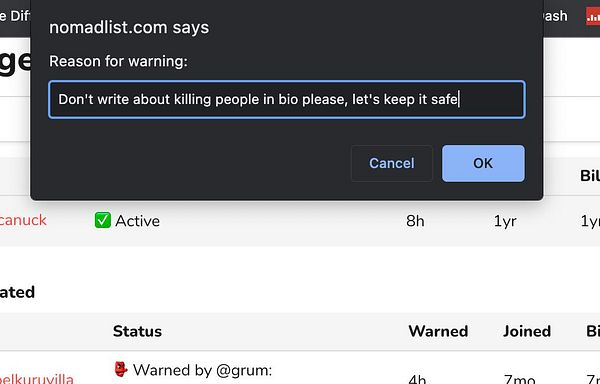 tell user to not write about killing people in his bio