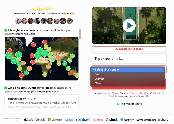 add gender dropdown on sign up before Stripe Checkout so we can save on Clearbit credits by only checking for gender on email if woman is selected #nomads