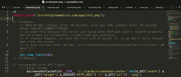 add CURL timeout and HTTP error code response checker to screenshot.php for the social media screenshots because if API Flash goes down, the script keeps running for non-cached screenshots; if API Flash times out or returns non-200 code, save the code to the cache file anyway so it doesn’t retry until in 30 days