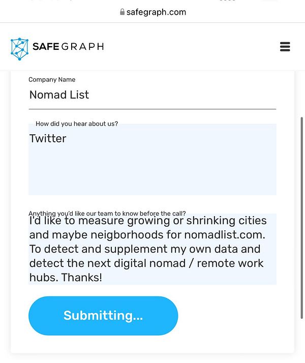 ask SafeGraph for location mobility data (like govs use during COVID) so I can predict growing nomad cities