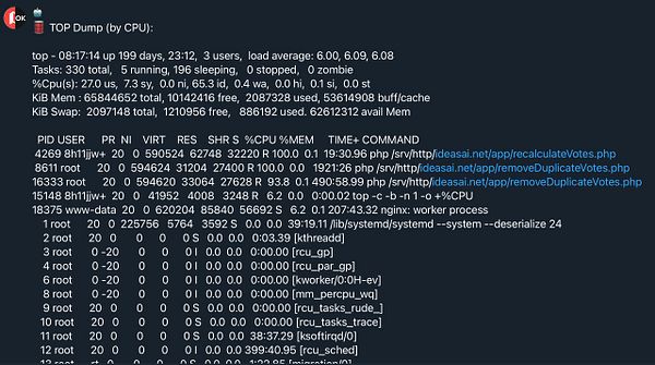 dump TOP to Telegram in case Uptimerobot monitors start failing while I sleep so I can figure out what cron jobs are taking up all resources #nomads#remoteok