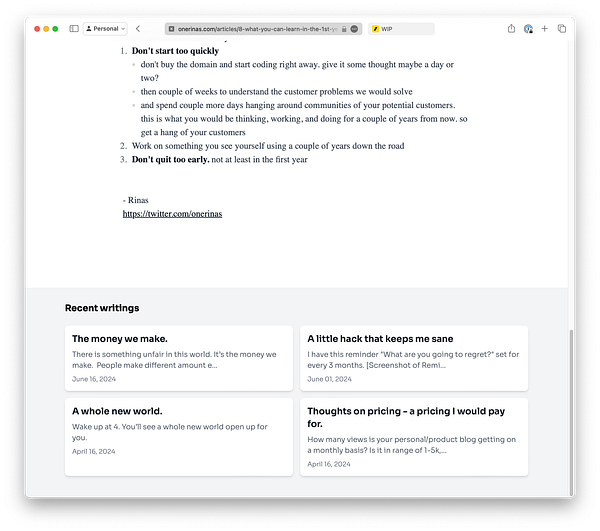 Add a "Recent writings" section below the article for readers to discover other articles in the blog easily
