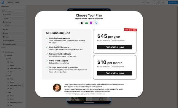 Show subscription plans when trying to export app instead of jumping straight to checkout