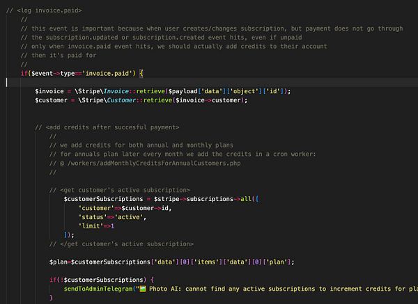 #photoai Stripe Webhook to only add credits for INVOICE.PAID event not SUBSCRIPTION.UPDATE because user's account was hacked and upgraded to $2999/year plan with 25,000 credits that were topped up without any payment, thx @AndreyAzimov