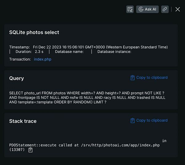 find #photoai bottleneck thanks to @daniellockyer with NewRelic and it was the average photo waiting time calculator SQL query that took 18 seconds and ran hourly and would take down the site