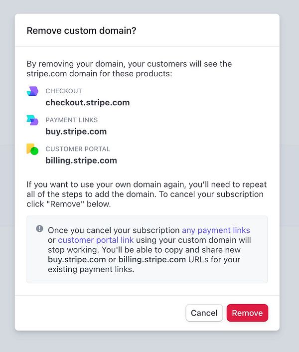 cancel custom domain for Stripe Billing Portal pay.photoai.com because it costs $120/year and we want to cut costs