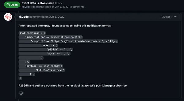 fix empty payload in Web Push because I had to literally put the keys from the web push subscription into the sub object not auth as the docs of web-push-php wrote