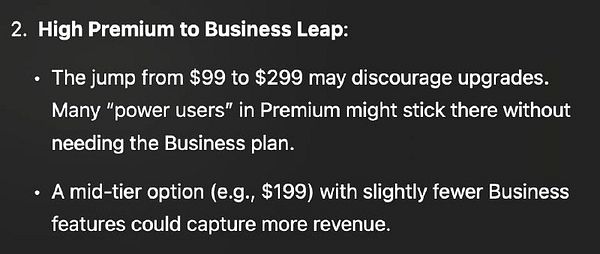 reduce Business plan from $299/mo to $199/mo because after analysis of the current customers per plan the gap between Premium and Business is too big