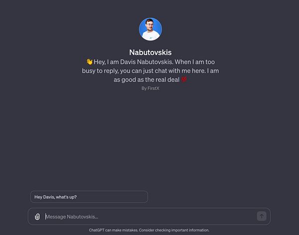 Launched a GPTs with myself, so that my girlfriend, family, friends or strangers can talk to me when I am busy.