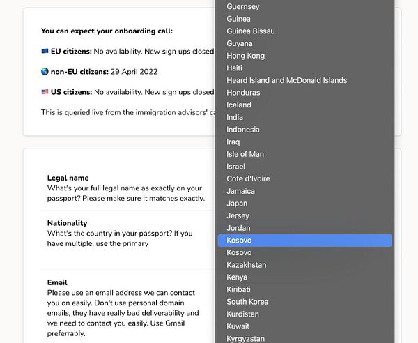 auto close and open sign ups separately for EU, non-EU and US citizens based on the 3 different immigration advisor calendars by removing the countries from the nationality list so they can’t be selected and displaying sign ups are closed or open #rebase