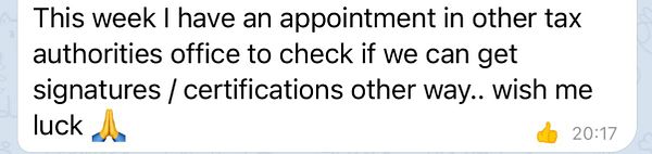 talk to lawyer, he will go to Portuguese tax authorities this week to talk about accepting digital signatures and forms so we can skip the physical process #rebase