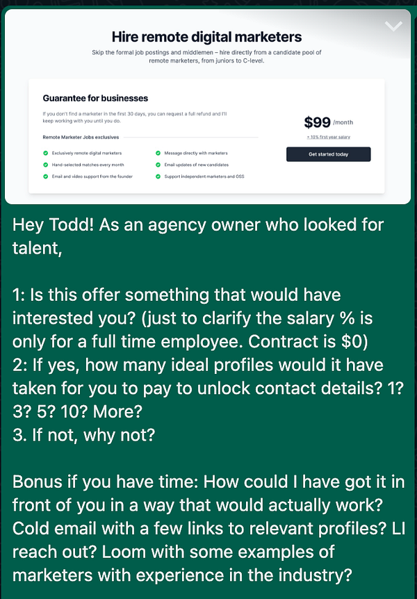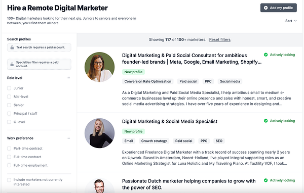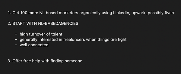 Make a plan of action on how I'm going to get my first marketer hired through the platform