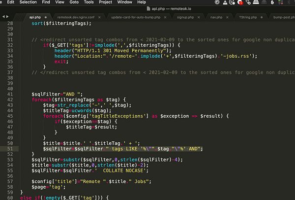 remove SQL injection possibility via #remoteok API via ?tags= which would be put in SQL directly due to old code from 2015 that I never changed to SQL value binding