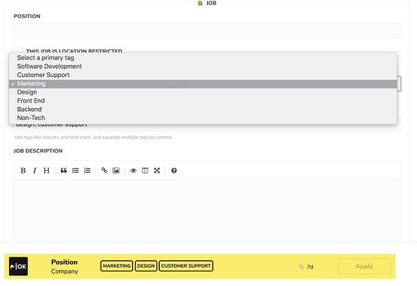 add primary tag selector like design, developer, front end, marketing non tech, as first tag