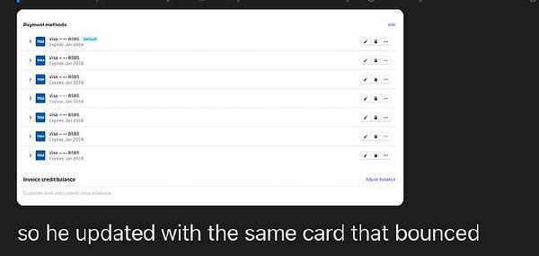 whose card bounced so they were asked to update it and then they updated it with the same card 8 times and asked us why it doesn’t work, well it doesn’t work cause their card bounces
