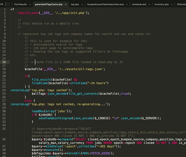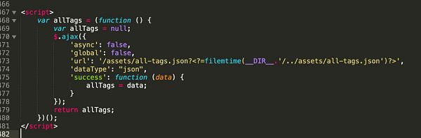 move tag cache code from head.php into a @daily ran worker that saves to /assets/all-tags.json for autocomplete in search, job post page, etc. #remoteok