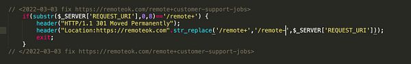 fix #remoteok redirect error because every tag page was showing a 301 but without a redirect just the page because we changed NGINX headers to let PHP handle the headers so that the 404 page could do smart redirecting