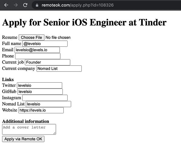 make prototype of easy apply button which pre-writes the job application form for you with your profile data from #remoteok workers and sends the company an email with everything in it so you can apply to jobs much faster