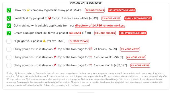 change [ Post your job ] to [ Start hiring ] to increase perception of value (e.g. a job post you can’t charge $$$ for but a verb of launching you can maybe) #remoteok