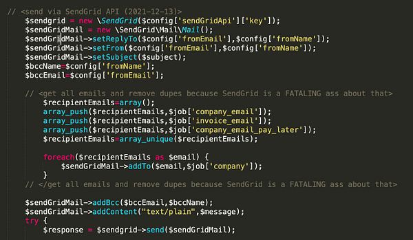 after job post emails (with edit link and invoice) because SendGrid likes to FATAL the moment you specify duplicate emails (why? nobody knows, probably taken over by chin stroking engineers)