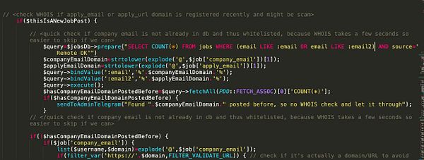 on posting job, before doing a WHOIS check on domain creation date of company_email, apply_email and apply_url (to avoid spammers registering fake domains and posting job scams), check if the domains are already posted in the db before and skip the WHOIS check because it takes anywhere from a second to 10 seconds for odd TLDs and can result in 502 timeout errors
