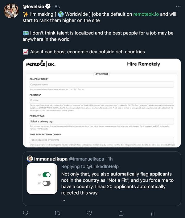 delete job post for company that “accidentally posted new jobs. No idea how, must be a miscommunication somewhere but they want to take down the other one.” #remoteok