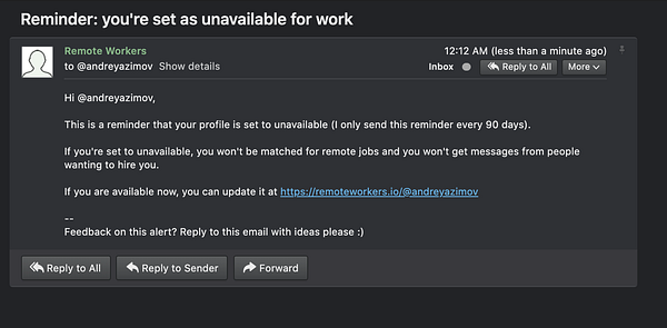 finish email reminder if user set to unavailable (every quarter)
