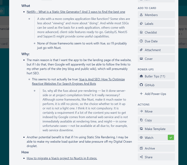 Spent time researching whether to switch the app to use Nuxt.js for server-side rendering / static site generation.