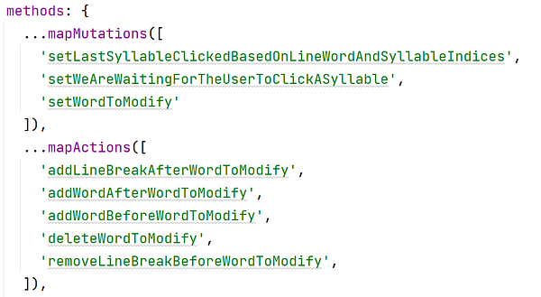 Use the array form of input to mapMutations and mapActions where possible to try to keep the code a little cleaner.