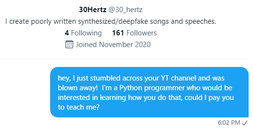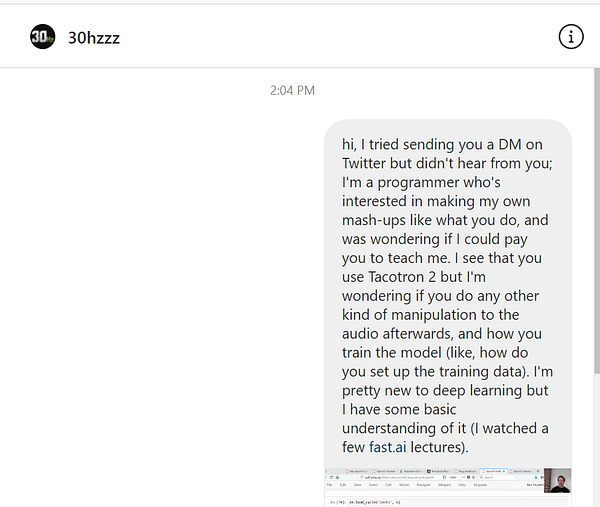 Sent a Twitter DM to YouTuber 30_hertz asking if I can pay him to teach me to do what he does.