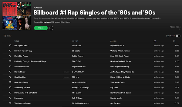 Created a Spotify playlist with the #1 rap singles from '89-'99 based on en.wikipedia.org/wiki/List_of… to better understand the evolution of rap and also to put it on my public wiki. open.spotify.com/playlist/5B1… www.rhymecraft.guru/wiki/disp…