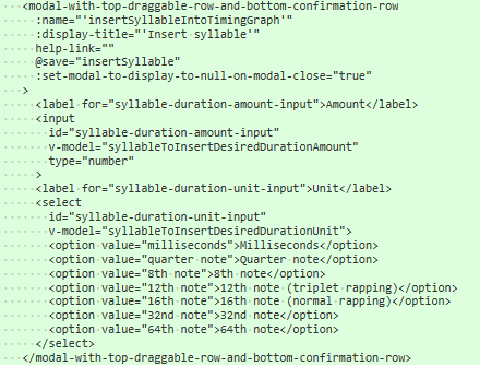 Continued working on a modal that will appear when a user adds a syllable to the timing graph, asking the user how long the syllable should be.