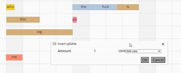 Get the modal working that lets you choose how long an inserted syllable should be sustained for.