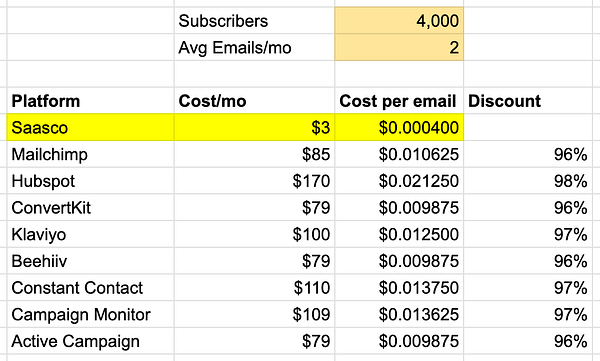Pricing sheet for Saasco emails vs other marketing tools, holding true to initial 90% saving thesis 👌