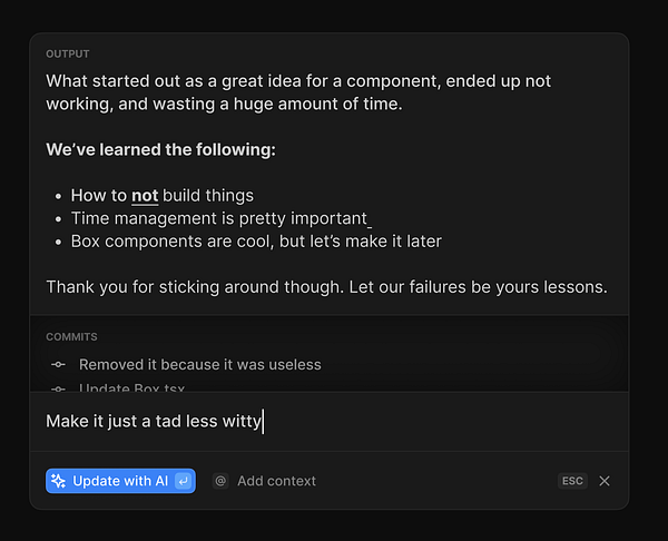 AI dialog state where it's typed a bunch of stuff based on your Github commits, but then you can edit it again.