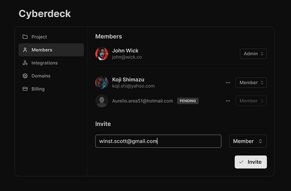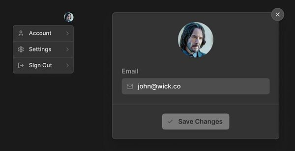 Define user dropdown and super simple dialog. Not focussed on UI color balance. Gotta keep shipping.