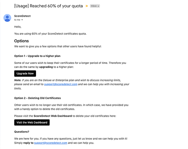 setting up usage warning emails once active subscriber hits a certain % of usage. That way, we can support them better on a higher plan, or ask them to reduce their certificates count. Currently using: Supabase Edge functions, Resend API, Supabase pg_cron, pg_net