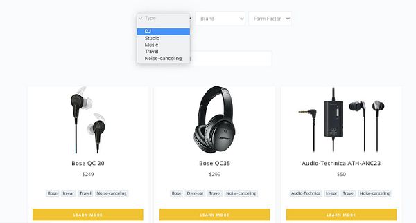 #sheet2site multi filters dropdowns. exclude filters that have zero results, so users do not need to try all combination and they will never see again “nothing found” error. @jumbotron9000 style