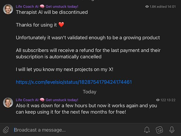 #therapistai for existing users while closing sign up for new ones, existing users can keep using it for free for next few months