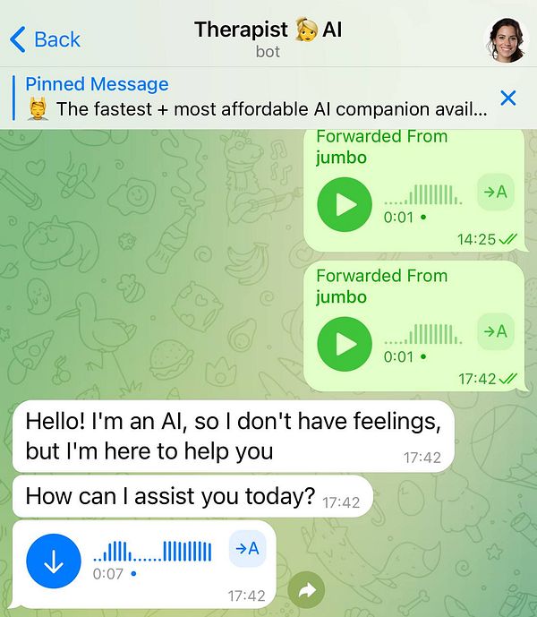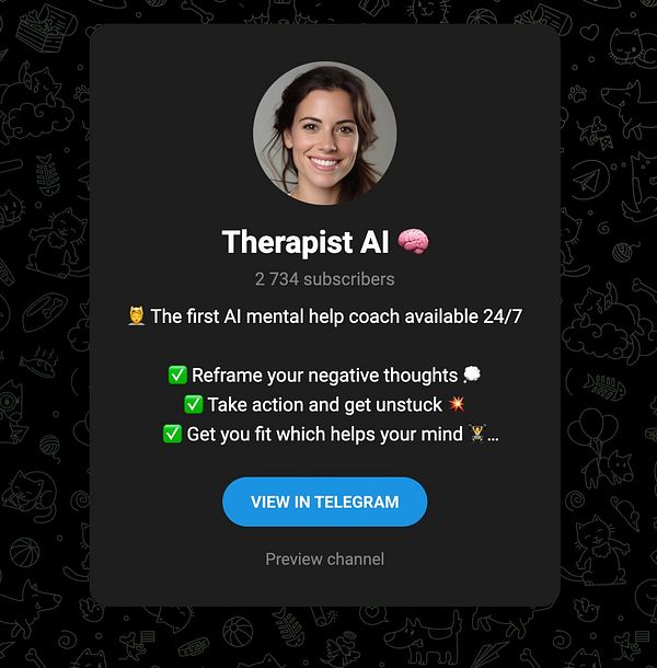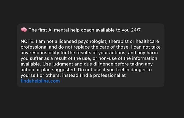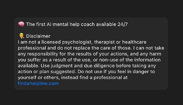 The first AI mental help coach available to you 24/7. Send me a chat or voice messages to talk to me.