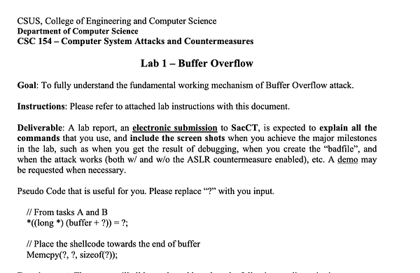 Finish lab 1, regarding the buffer overflow exploit